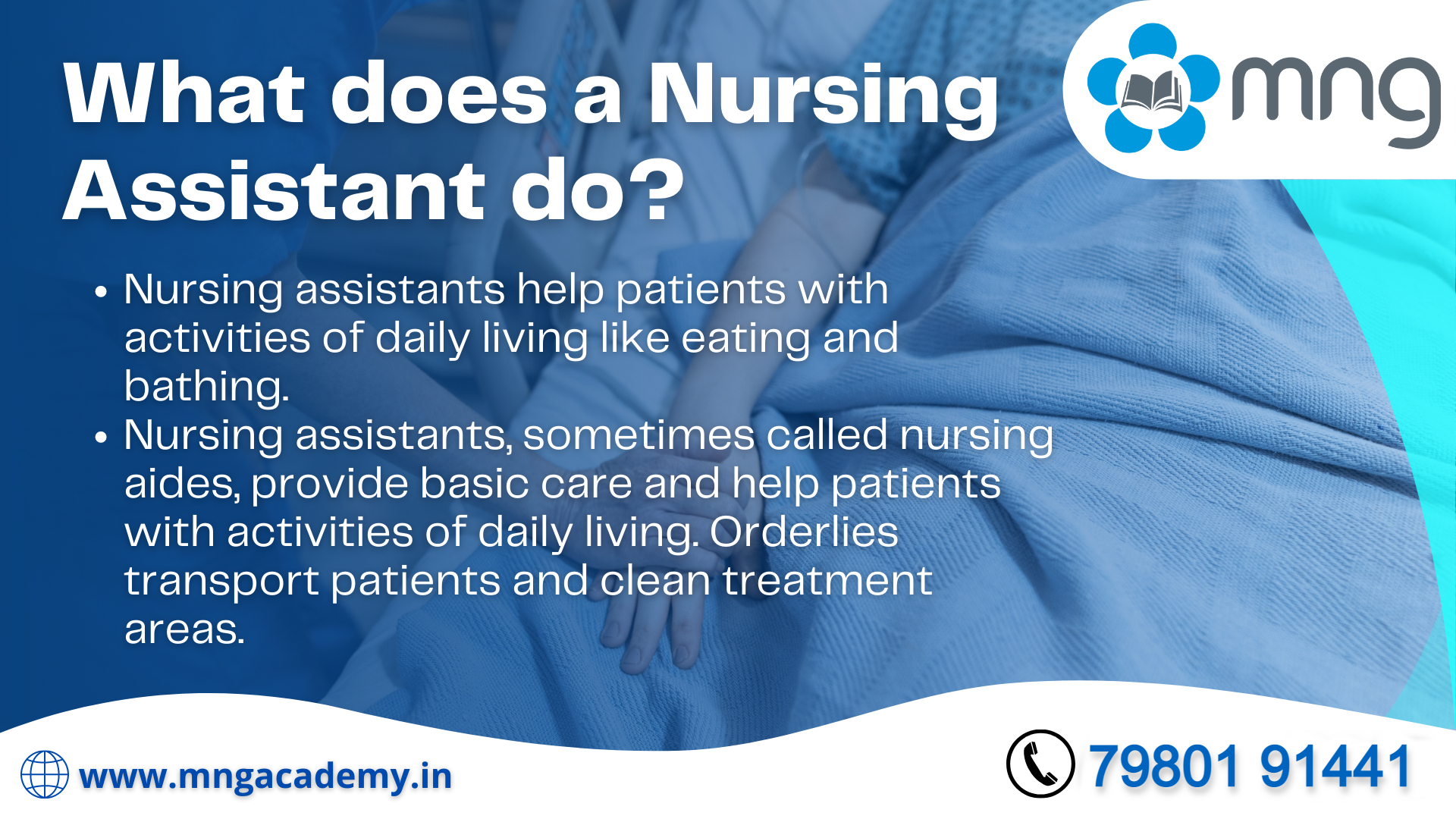 Nursing assistants (General Duty Nursing Assistant) are essential in the field of nursing. They are trained to provide basic nursing care to patients. They are responsible for transferring patients from their beds to chairs, to wheelchairs, and to the toilet. They are also responsible for cleaning the patient's room and providing personal care. Nursing assistants are also essential in the field of psychiatric nursing.